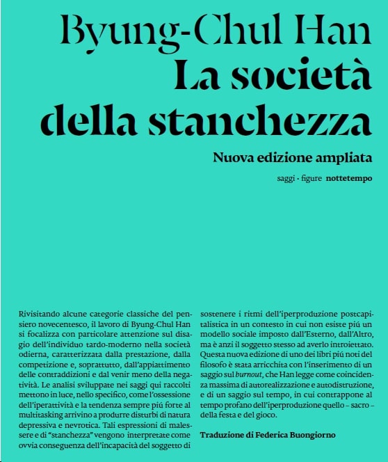 Rivisitando alcune categorie classiche del pensiero novecentesco, il lavoro di Byung-Chul Han si focalizza con particolare attenzione sul disagio dell’individuo tardo-moderno nella società odierna, caratterizzata dalla prestazione, dalla competizione e, soprattutto, dall’appiattimento delle contraddizioni e dal venir meno della negatività. Le analisi sviluppate nei saggi qui raccolti mettono in luce, nello specifico, come l’ossessione dell’iperattività e la tendenza sempre più forte al multitasking arrivino a produrre disturbi di natura depressiva e nevrotica. Tali espressioni di malessere e di “stanchezza” vengono interpretate come ovvia conseguenza dell’incapacità del soggetto di sostenere i ritmi dell’iperproduzione postcapitalistica in un contesto in cui non esiste più un modello sociale imposto dall’Esterno, dall’Altro, ma è anzi il soggetto stesso ad averlo introiettato. Questa nuova edizione è stata arricchita con l’inserimento di un saggio sul burnout, che Han legge come coincidenza massima di autorealizzazione e autodistruzione, e di un saggio sul tempo, in cui contrappone al tempo profano dell’iperproduzione quello – sacro – della festa e del gioco.