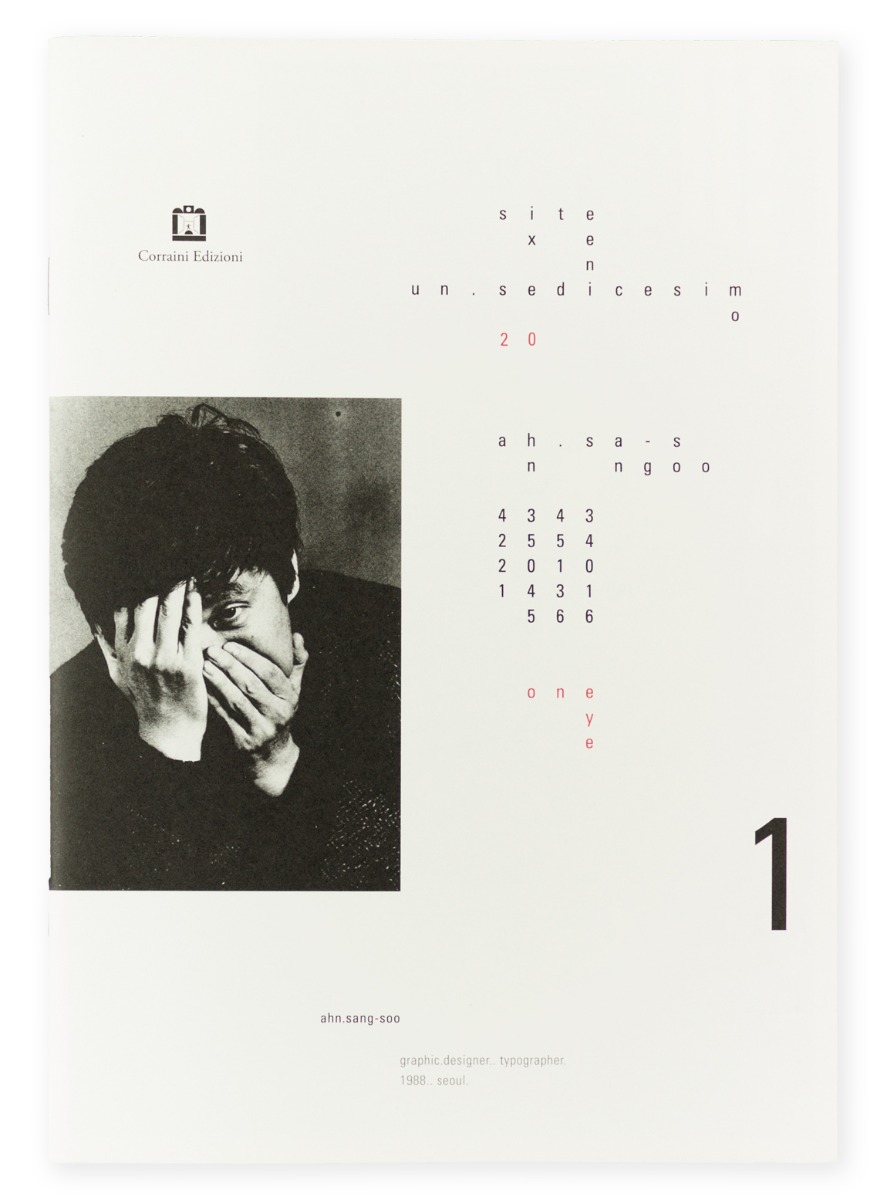 Ahn Sang-Soo, maestro coreano del design tipografico, trasforma il ventesimo numero di Un Sedicesimo in un progetto fotografico, una selezione di sedici scatti per il suo progetto One eye. Danzatrici, musicisti, designers, studenti, professori, hostess sono in posa nei più diversi contesti, coprendosi un occhio con la mano: una serie di foto ricordo di visi sorpresi dall’insolita richiesta di Ahn Sang-Soo. Sedici fotografie, una per pagina, corredate da una didascalia che ricorda l’occasione in cui sono state scattate.
