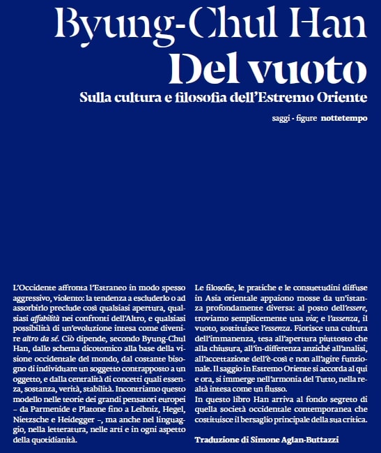 L’Occidente affronta l’Estraneo in modo spesso aggressivo, violento: la tendenza a escluderlo o ad assorbirlo preclude così qualsiasi apertura, qualsiasi affabilità nei confronti dell’Altro, e qualsiasi possibilità di un’evoluzione intesa come divenire altro da sé. Ciò dipende, secondo Byung-Chul Han, dallo schema dicotomico alla base della visione occidentale del mondo, dal costante bisogno di individuare un soggetto contrapposto a un oggetto, e dalla centralità di concetti quali essenza, sostanza, verità, stabilità. Incontriamo questo modello nelle teorie dei grandi pensatori europei – da Parmenide e Platone fino a Leibniz, Hegel, Nietzsche e Heidegger –, ma anche nel linguaggio, nella letteratura, nelle arti e in ogni aspetto della quotidianità. Le filosofie, le pratiche e le consuetudini diffuse in Asia orientale appaiono mosse da un’istanza profondamente diversa: al posto dell’essere, troviamo semplicemente una via; e l’assenza, il vuoto, sostituisce l’essenza. Fiorisce una cultura dell’immanenza, tesa all’apertura piuttosto che alla chiusura, all’in-differenza anziché all’analisi, all’accettazione dell’è-così e non all’agire funzionale. Il saggio in Estremo Oriente si accorda al qui e ora, si immerge nell’armonia del Tutto, nella realtà intesa come un flusso. In questo libro Han arriva al fondo segreto di quella società occidentale contemporanea che costituisce il bersaglio principale della sua critica.